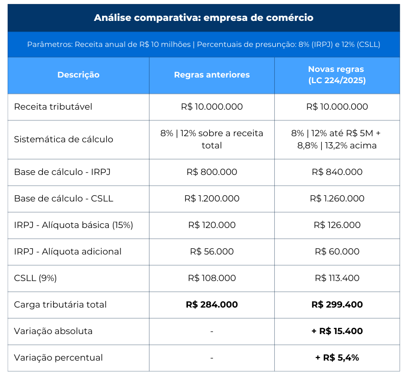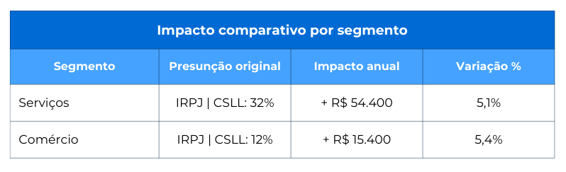 Empresas com faturamento até este limite não sofrem alterações. Os percentuais de presunção permanecem conforme estabelecidos na legislação vigente: