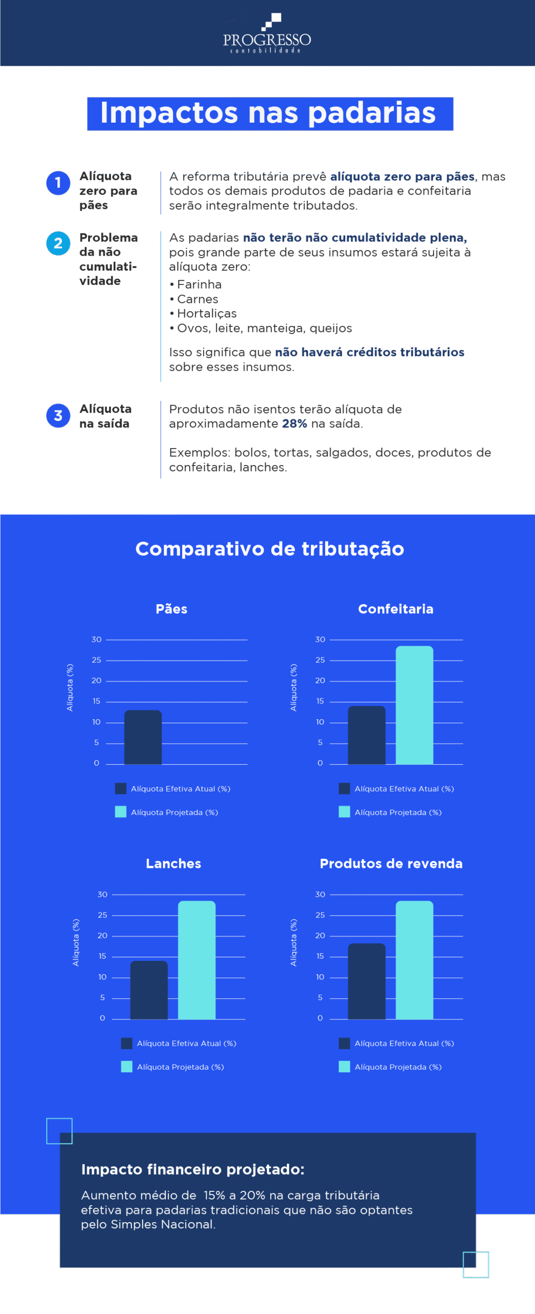 Padarias e pequenos comércios alimentícios poderão enfrentar desafios específicos com a mudança no regime de tributos. A Progresso Contabilidade oferece atendimento personalizado, ajudando esses empreendedores a se organizarem financeiramente, aproveitarem regimes mais vantajosos e manterem a regularidade fiscal diante das novas regras, afinal, em mais de 50 anos de atuação, apoiar negócios de alimentação tornou-se parte de nossa missão. Agende uma reunião de consultoria e entenda com nossa equipe quais passos você deve dar para preparar sua empresa de panificação.